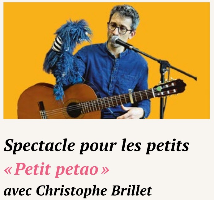 Dans le cadre du Festival Gallo en Scène, nous accueillons Christophe Brillet, conteur et musicien, pour son spectacle musical "Petit Petao" accompagné de sa marionnette Joachin, des chansons pour la garçâille : une animation qui enchantera les enfants.