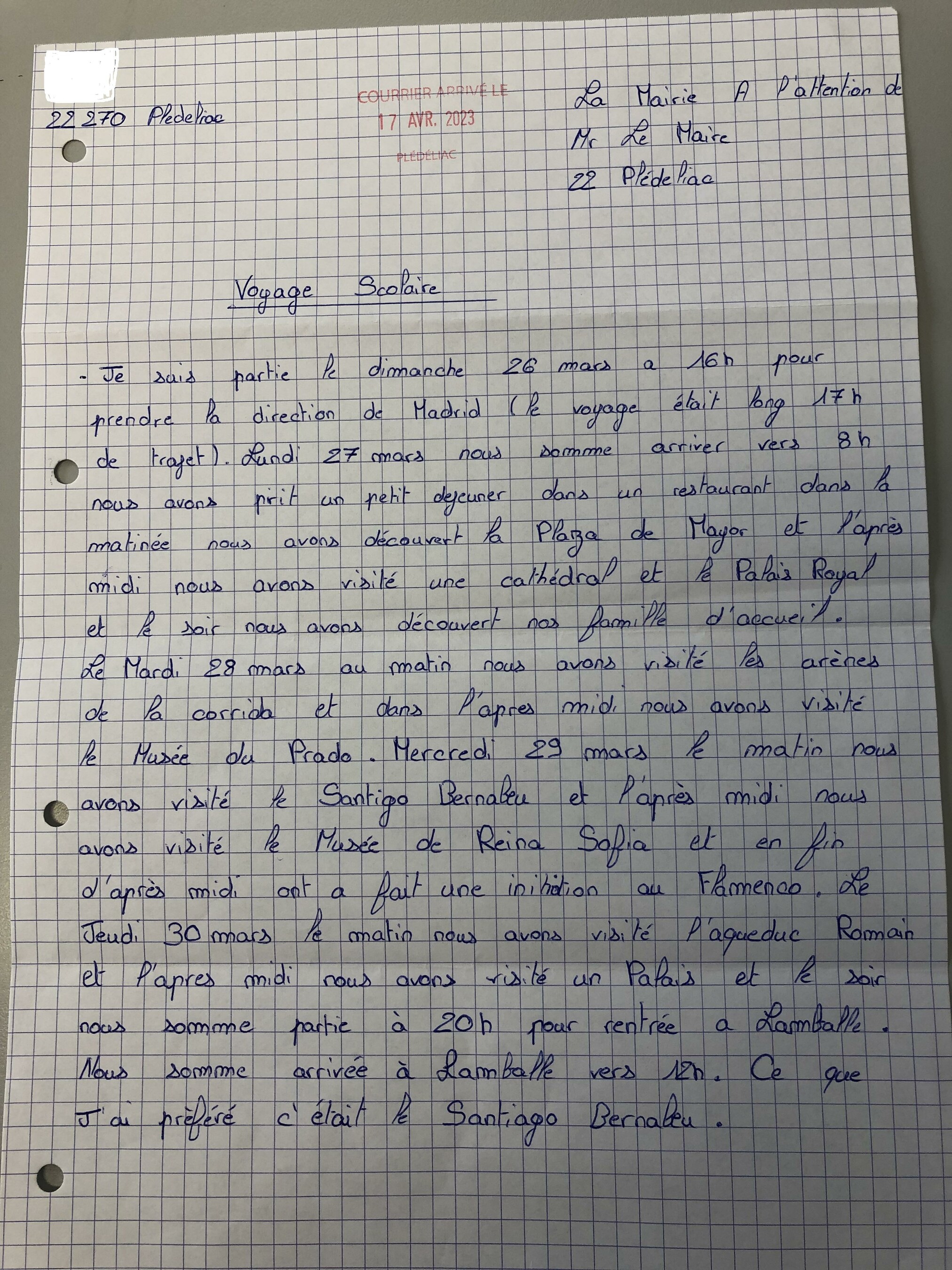 Lorsque le conseil municipal accorde une subvention, il est demandé aux élèves d'adresser un compte rendu de leur séjour à l'issue, dont il est fait part en réunion de conseil municipal.