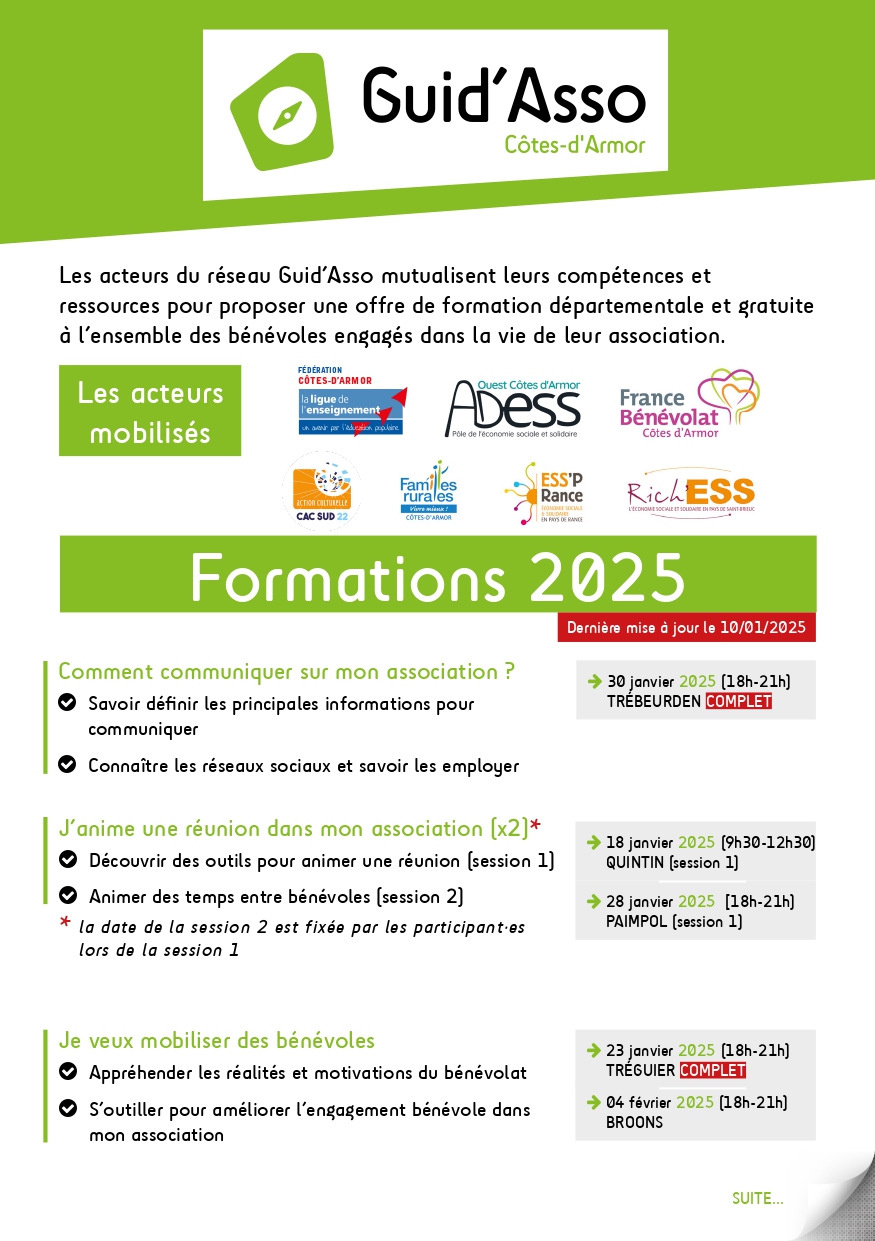 2 – Formations gratuites à l’attention des bénévoles…suite !Vous êtes responsable associatif et vous aimeriez être sûr de toutes les responsabilités qui vous incombent ?Vous pensez être couvert par votre assurance et vous voulez être certain d’avoir compris toutes les petites lignes écrites en bas de page ?Vous voulez en savoir plus sur la réglementation et vos responsabilités en tant qu’organisateur d’événement accueillant des bénévoles et du public ?Cette formation est faite pour vous !La Ligue de l’Enseignement des Côtes d’Armor vous donnons rendez-vous vendredi 17 janvier à 18h pour une fin de journée formatrice et conviviale, qui vous permettra d’étayer vos connaissances et de sécuriser votre rôle d’administrateur ou d’administratrice associative.Informations et inscriptions en pièces jointe. Renseignements : Christophe CAPEL, vieassociative@laligue22.org 02 96 94 16 083 – Formations à l’attention des bénévoles…suite et finLe pôle ESS P’Rance organise une formation "Comptabilité associative : initiation et mise en pratique", les Lundis 27 janvier, 3, 10 et 17 février 2025 à Corseul.Vous avez besoin d’acquérir ou revoir les bases de la comptabilité ?Vous êtes amené.e à faire de la comptabilité associative ?
