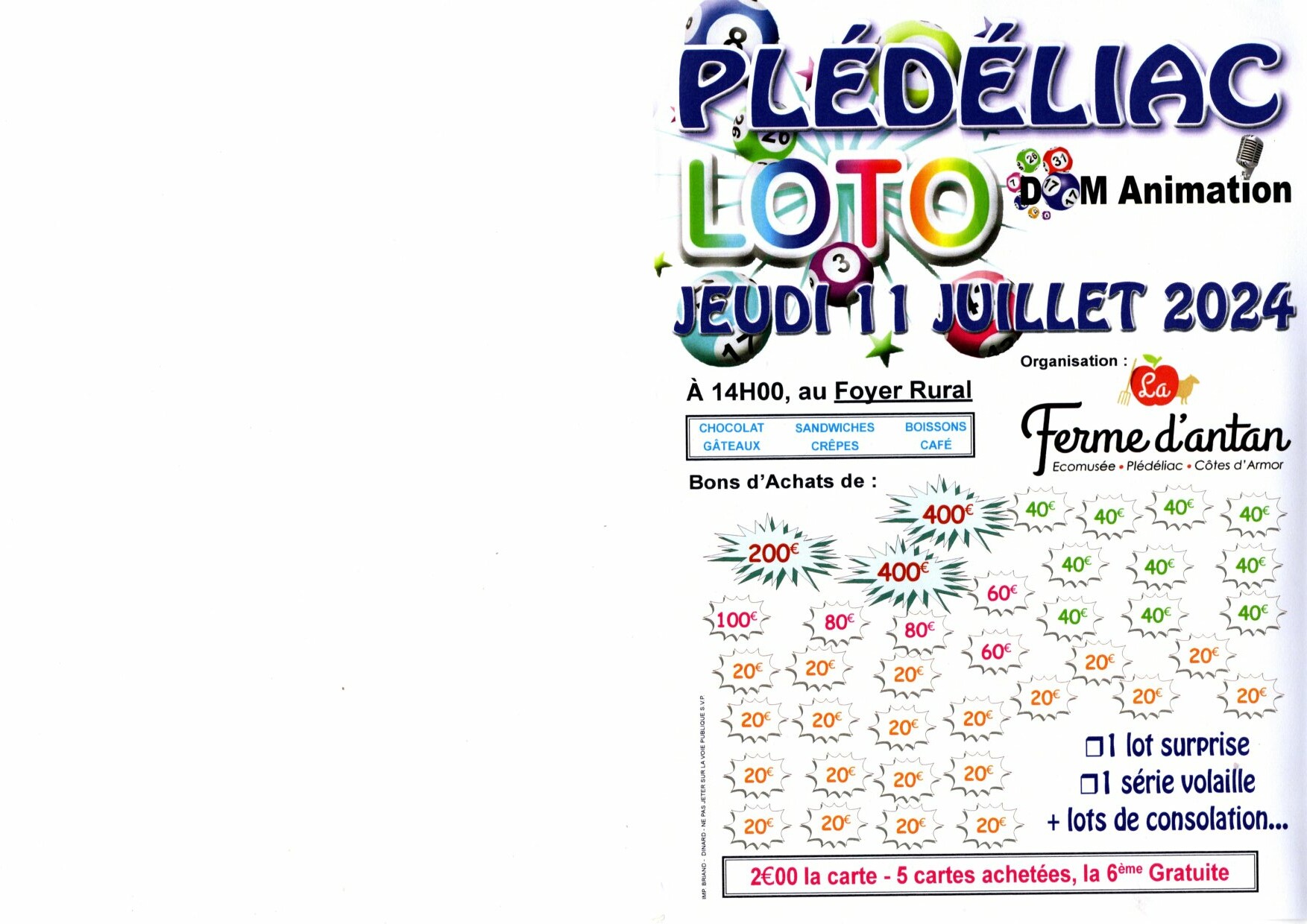 LOTO qui se déroulera le Jeudi 11 juillet à 14h au foyer rural de Plédéliac.