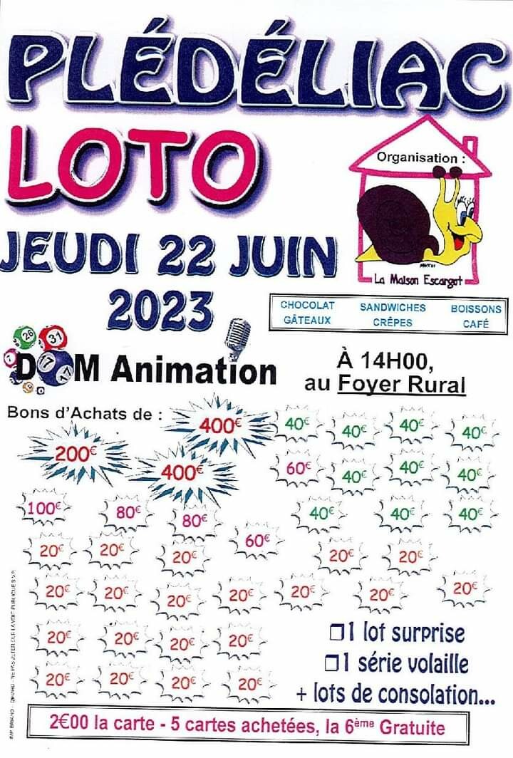 Jeudi 22 juin=] : Loto au profit de « La Maison Escargot » à Plédéliac.